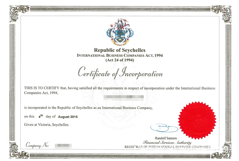 (塞舌爾公司注冊證書樣本)